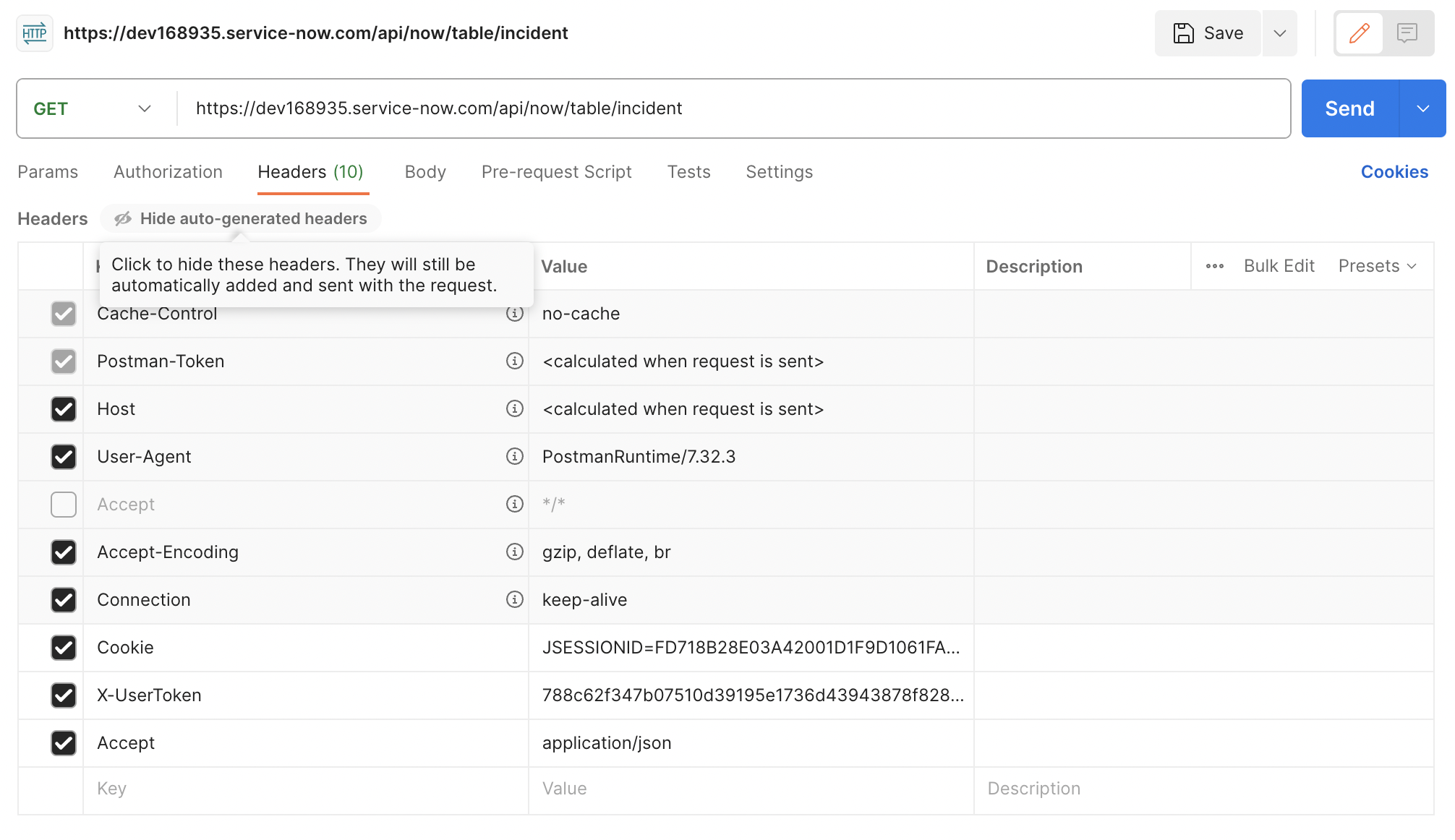 incidenttable, you would enterhttps://<instance-name>.service-now.com/api/now/table/incident. - Add a header called "Cookie" and set its value to