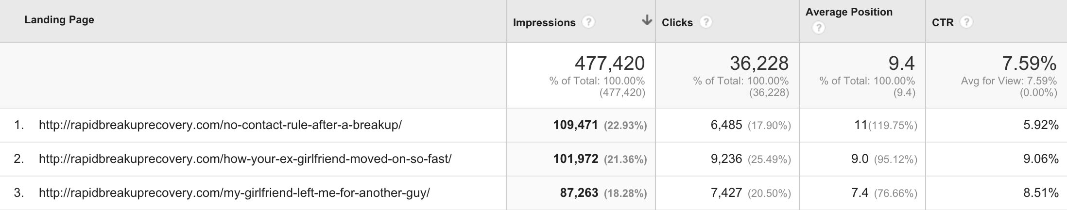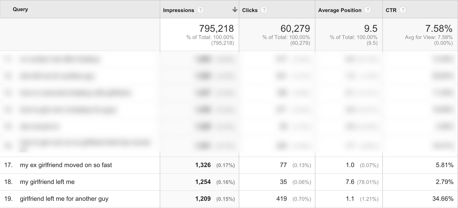 My strategy of targeting low-volume keywords that seemed highly likely to correspond to my target audience, such as “my girlfriend left me” or “girlfriend left me for another guy”, turned out to be successful.