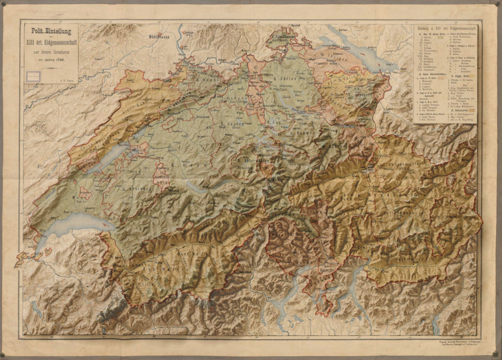 Digitally rendered 3D elevation + 1798 political map of Switzerland