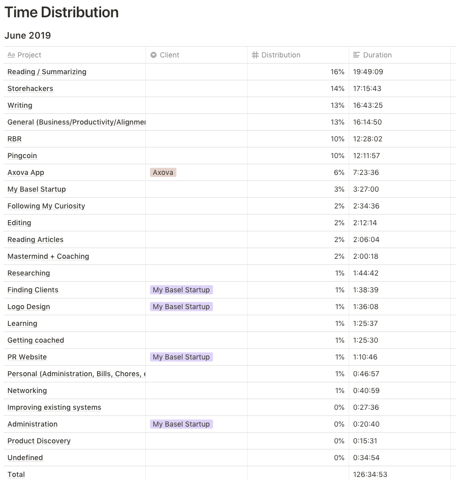 I also spent a good deal of my time (13%) writing. This is because I've been consistent with my new writing habit, however, I haven't been able to design my habit in such a way that it is leading to a consistent publishing schedule as well. This is undoubtedly the next step. I published a blog post (opens in a new tab) going into a bit more detail about this.