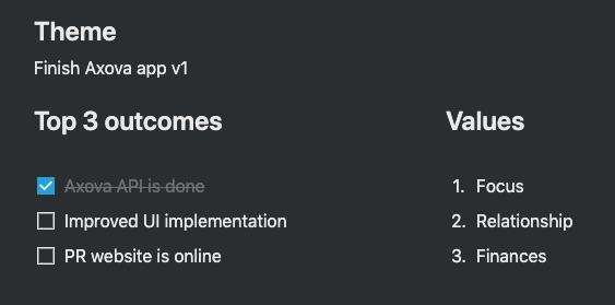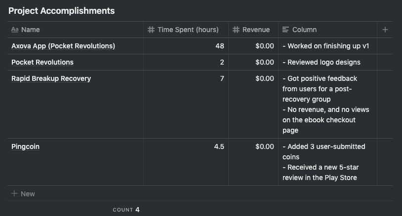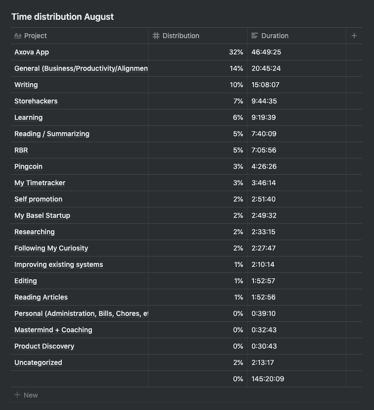 This month I spent 32% of my productive time on my main focus: The Axova App (the app for my first client). In my experience with time tracking so far 50% is a good target to have for my main focus. If I fall below 50% I know I wasn't truly focused on it. 50% may sound low, but it takes into account that I spend 14% on General tasks such as writing up this retrospective and 10% on writing.