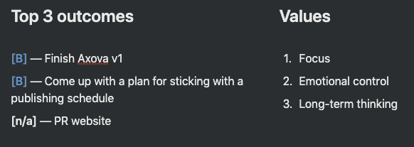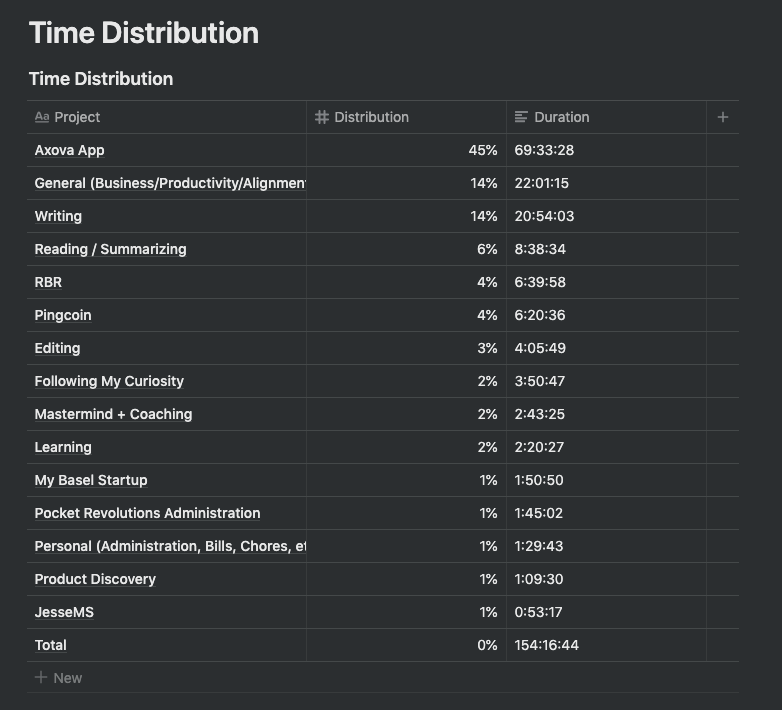 September was a month where I truly tried to focus on one thing: Finishing the first version of my first client's (Axova's) app. This was reflected in the main goal of the month (Finish Axova v1) as well as in the values I was targeting for September (Focus, Emotional control and Long-term thinking). The result is a [B] grade. I spent nearly 50% of my time on the Axova project, 50% being the highest measure of focus I've been able to achieve. (This figure is much higher when compared only to time spent on other side projects). The resulting grade is not an [A] because I didn't end of finishing v1 (which admittedly has more to do with my estimation abilities).