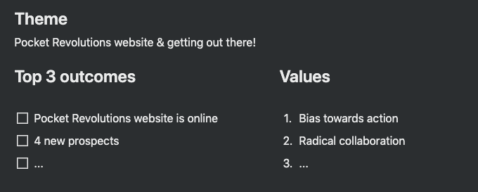 I consistently overestimate how much I can do and how much I am able to focus. This is the 3rd month that I've set as a goal to finish the Pocket Revolutions website. On the one hand I'm underestimating the time it takes me to figure out the technical implementation. On the other hand I suspect I'm being overly perfectionistic. This is why for January I want to focus more on a bias towards action.