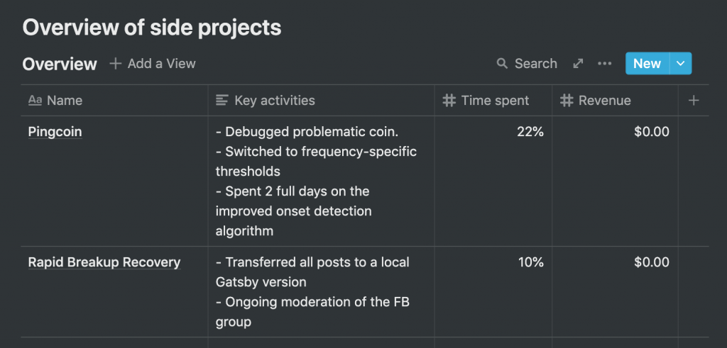 As I will detail in the side-projects section, my time spent in these side-projects was well spent, and upon first analysis I don't regret spending it the way I did. What I do feel funny about is not being able to foresee this expenditure to begin with. Why, for instance, did I decide to spend time porting the RBR site to Gatsby this month? I'm not sure I have a good answer to that question other than that it seemed a good idea at the time (yet somehow not good enough to surface during my monthly planning).