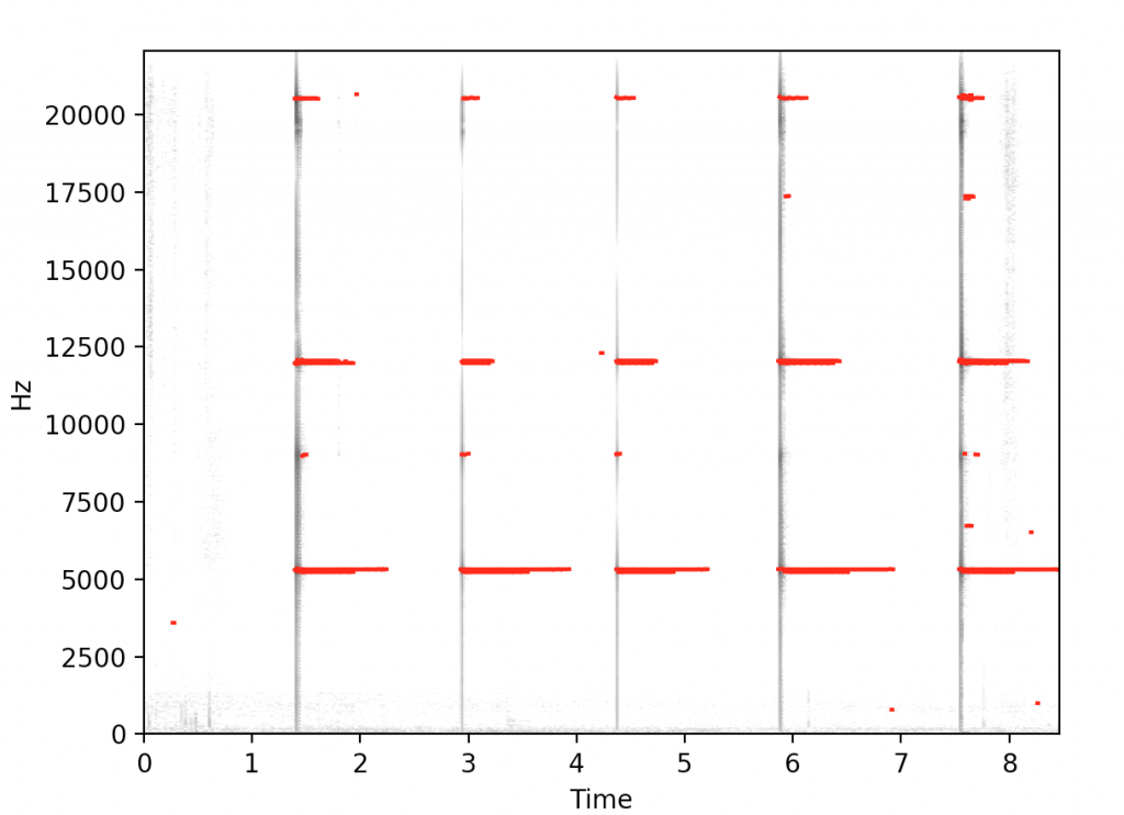 I'm happy to say that by devoting slightly over two days to this task, I now have an environment set up where I can easily load up coin recordings, plot their spectrograms and swap in onset detection algorithms. A result of one such algorithm can be seen below. Spread out across the y-axis you see vertical lines corresponding to coin strikes with the sustained "pinggg" sounds as horizontal lines starting at each strike. The red lines are the ping sounds that are extracted by the algorithm I'm using. Setting up cross-validation is the next step.