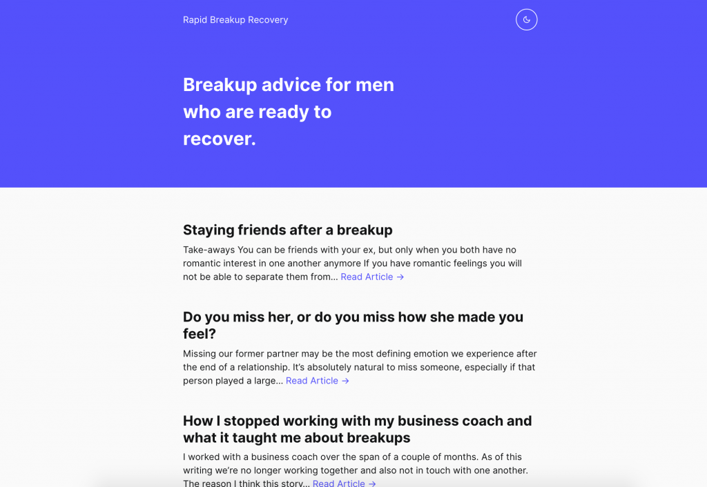 There are some tweaks that still need to be made to the theme, but after that I will be ready to launch a new version of Rapid Breakup Recovery. A version I will hopefully be able to iterate on more quickly.