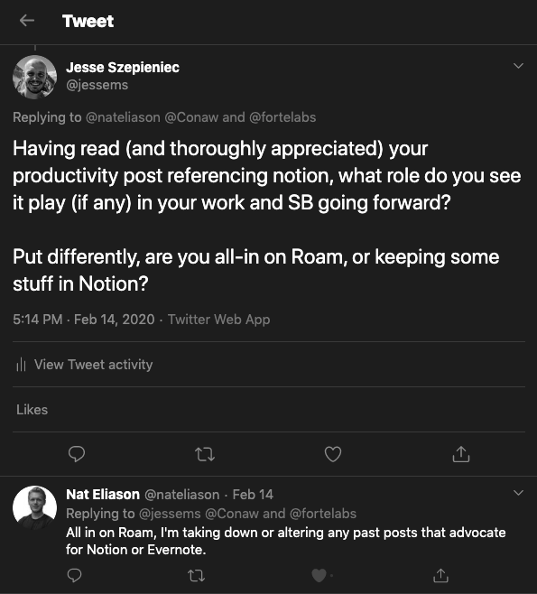 After reading Nat Eliason tweets about Roam (specifically his reply to mine stating he's going all-in) and watching a video of him pulling together an article (opens in a new tab), I became intrigued by this new knowledge management application.