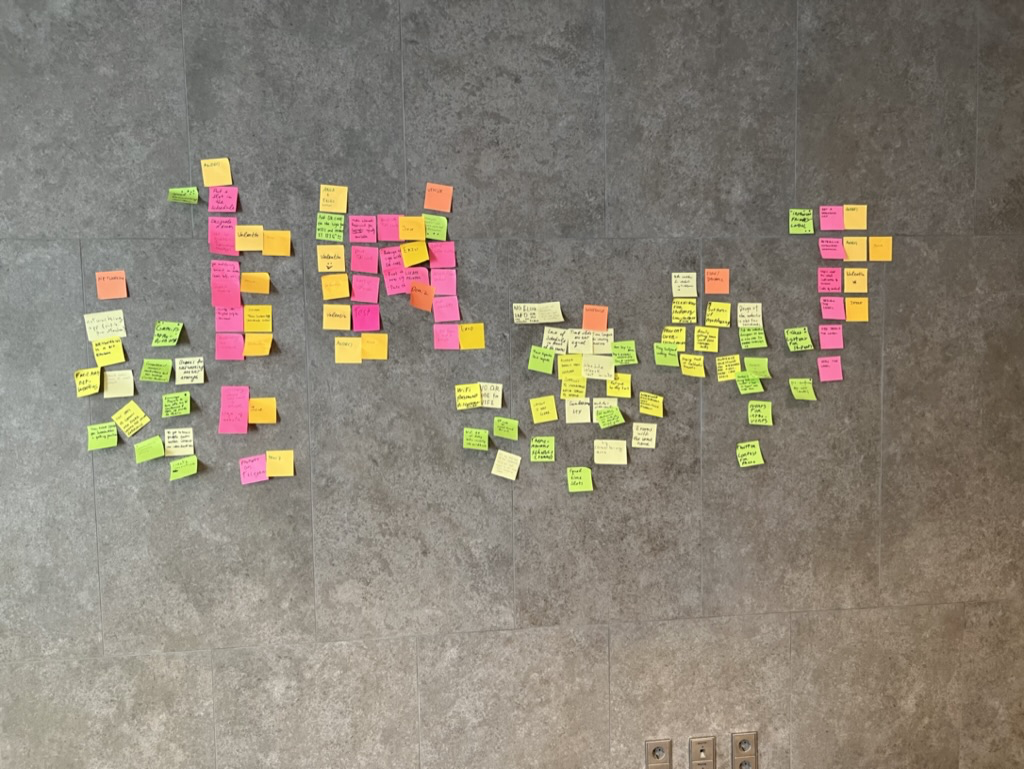 The second part of the workshop was generating solutions within those clusters. Again, one solution per post-it. After generating a bunch of solutions the participants voted on the best solutions by drawing dots on the post-its. There was an implicit constraint present here. Because the participants knew that they would need to implement the solution that same day, only the more realistic solutions got upvoted.