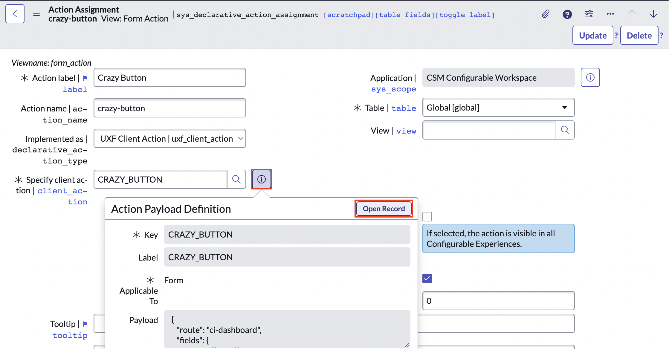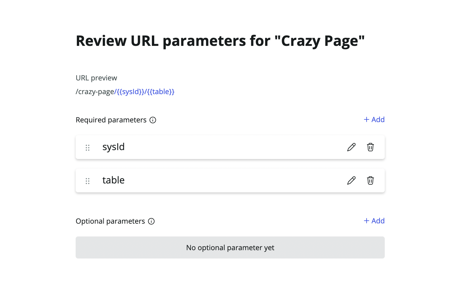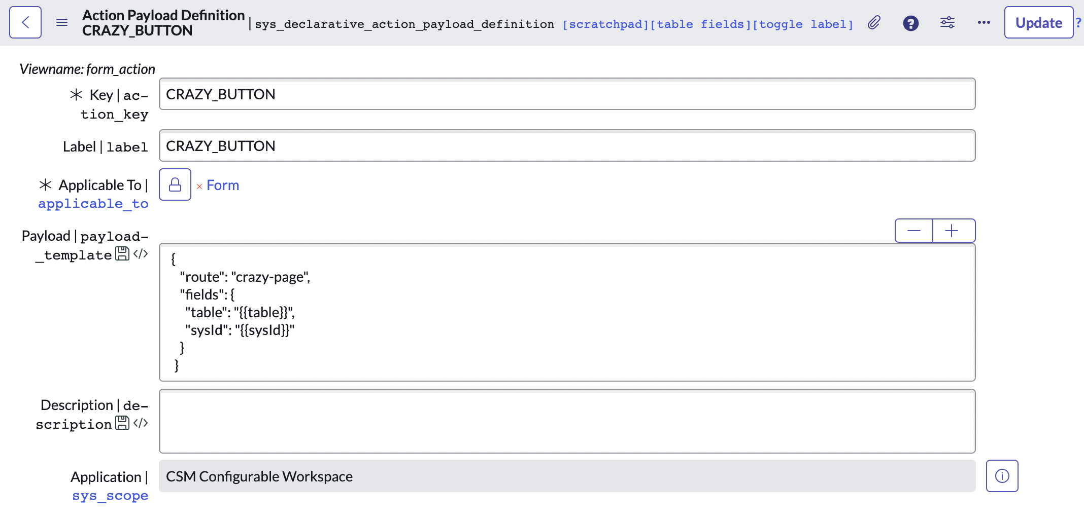 routekey tells SN where to look for our Page and we can use thefieldkey to pass variables from the current context:{ "route": "crazy-page", "fields": { "table": "{{table}}", "sysId": "{{sysId}}" } } -