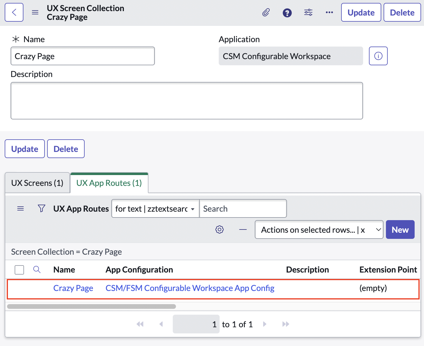sys_ux_screen_typerecord open the UX App Routes tab in the Related Lists section. It should have one entry called "Crazy Page" based on what we defined in Step 1. Click it to open the UX App Route record.