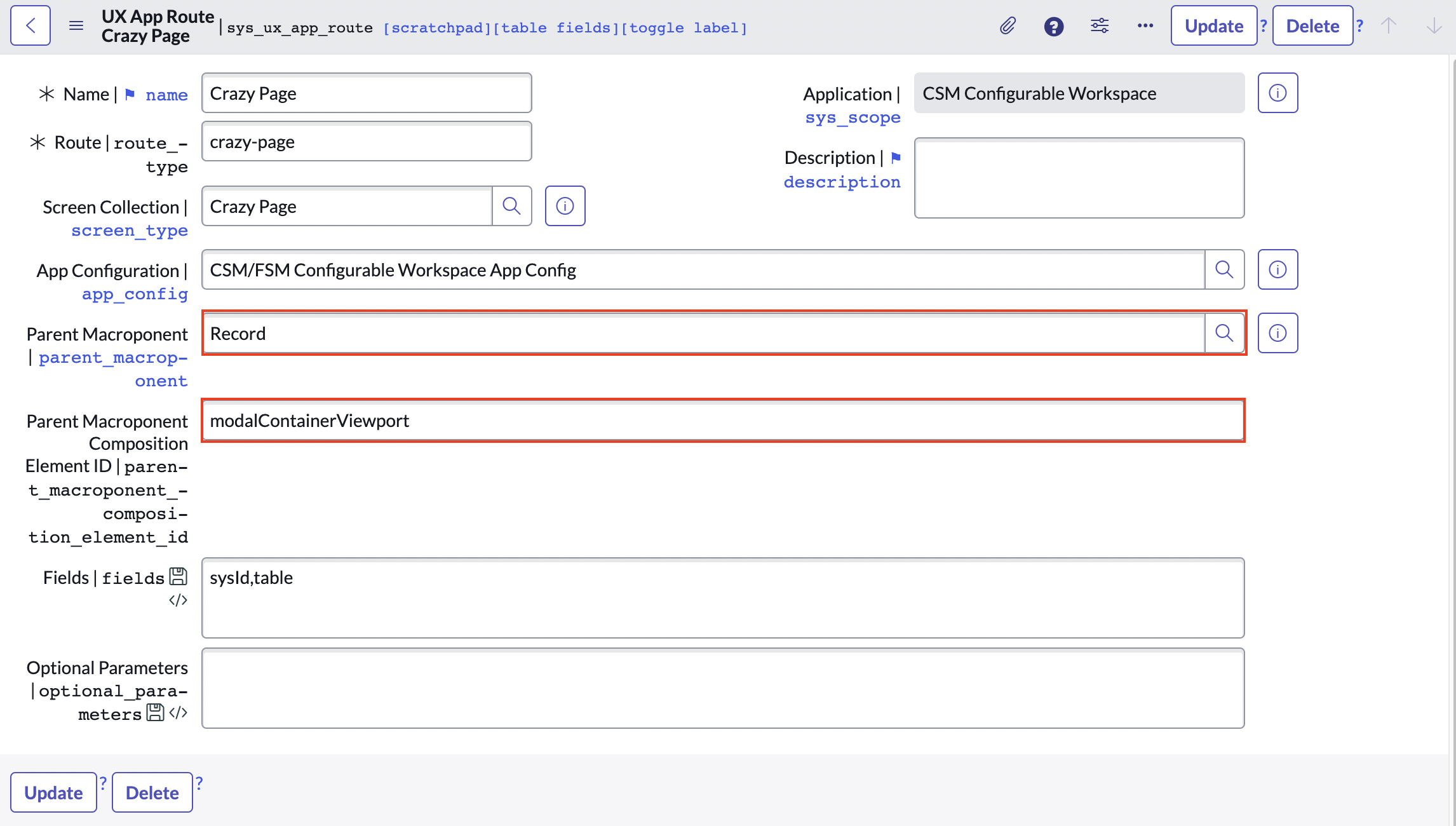 sys_ux_app_routerecord open. Use the SN Utils double click function to double click on the name of the "Parent Macroponent" field to open its machine readable value in a browser alert modal. -