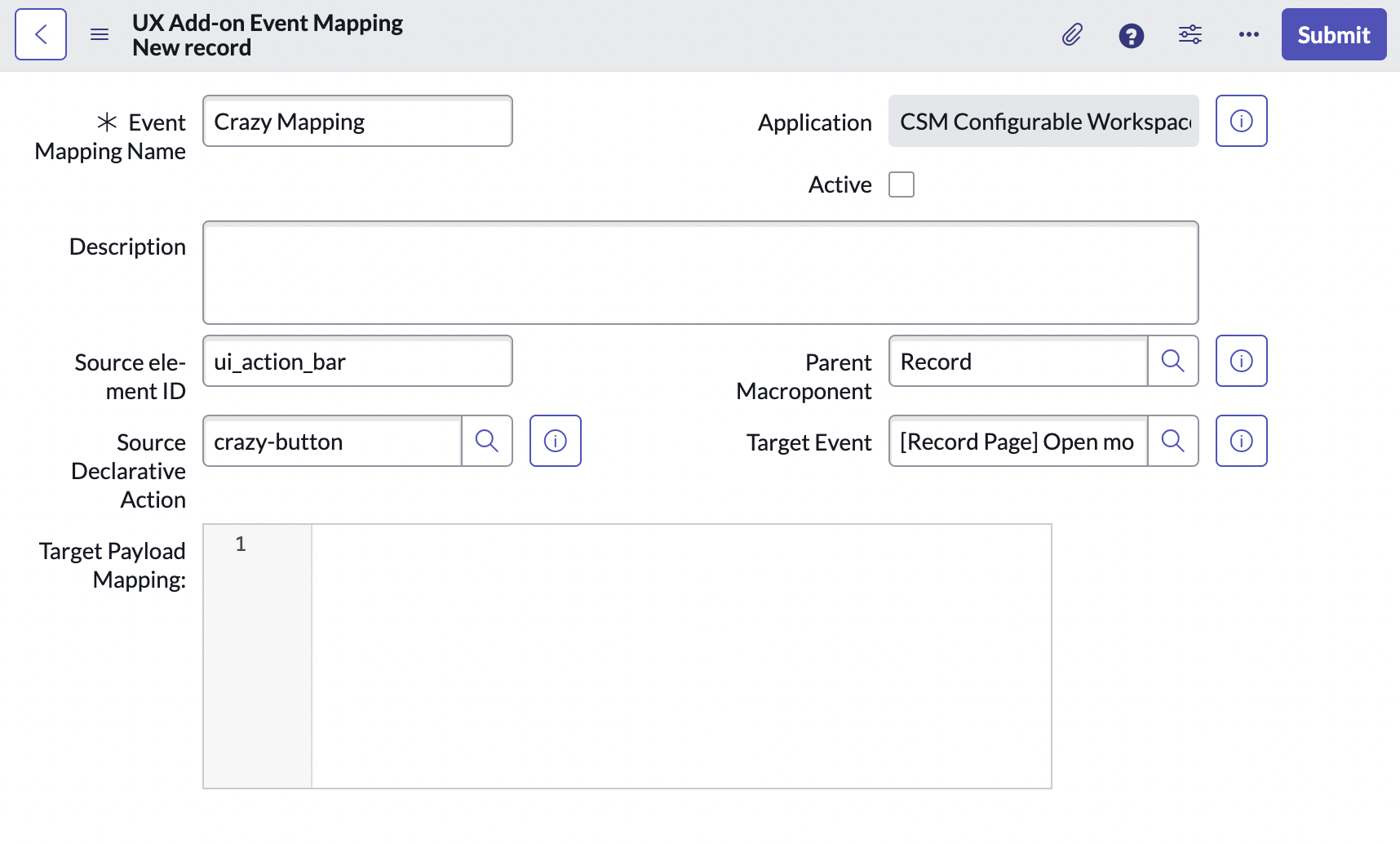 What's left is for us to connect the button with the Modal. What's more we want to pass information from the Record to the Modal. What's left for us is mapping the Button click event to the Modal launch event. Te way this is done is through a UX Add-on Event Mapping Record (sys_ux_addon_event_mapping).