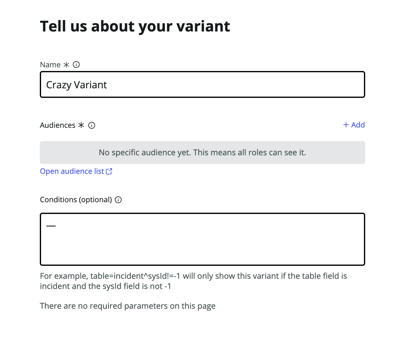 - On the next screen ("Tell us about your variant") give your Variant a name. This will be what shows up in the Page overview. Let's call our variant "Crazy Variant" Leave the rest as is.