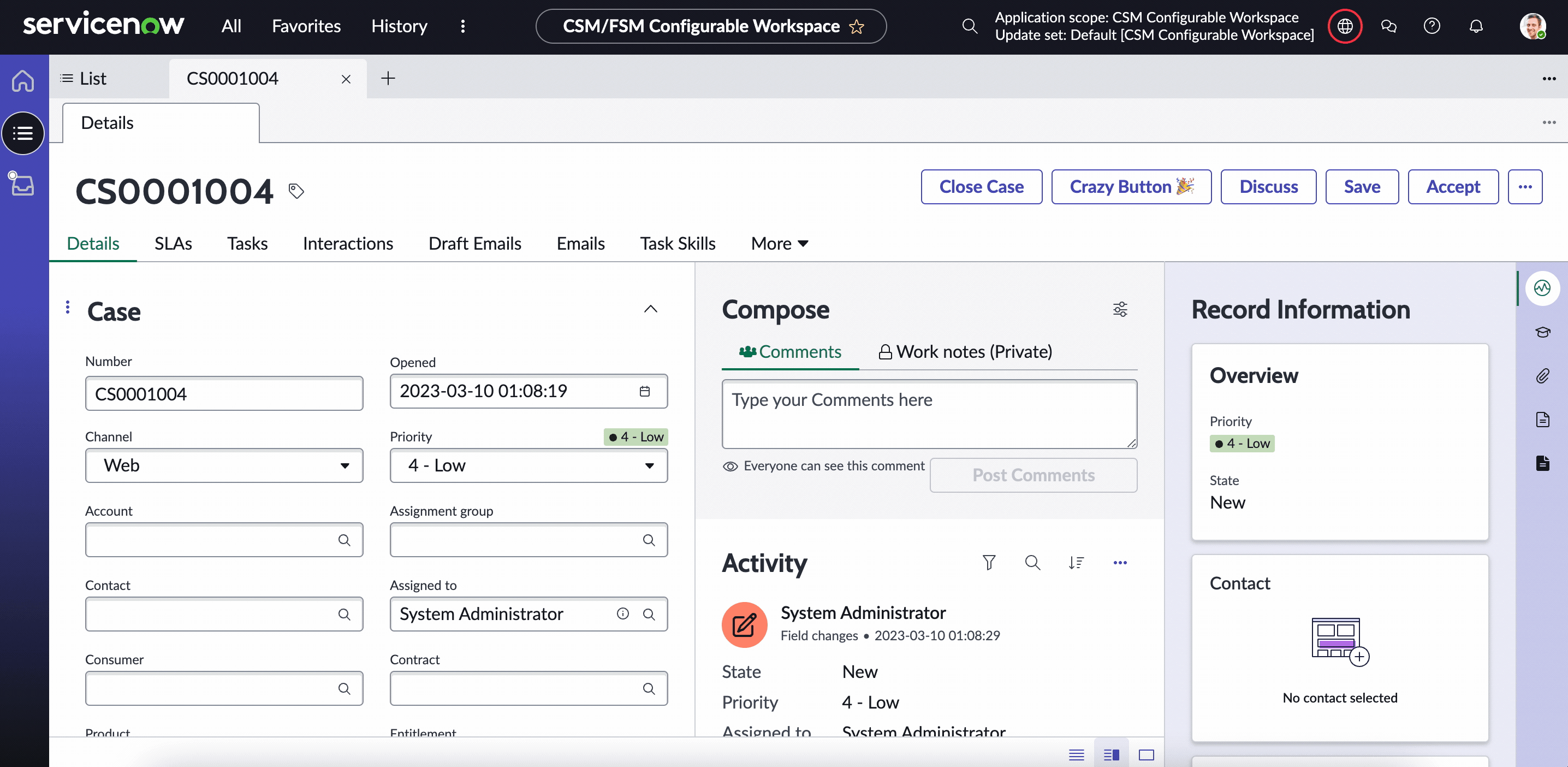Now open the CSM/FSM Configurable Workspace, navigate to the Case Record and test the button.