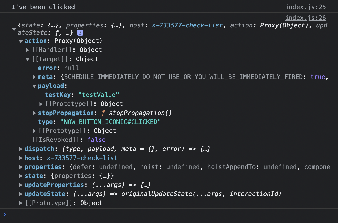 If we then drill down into action.[[Target]].payload we can see the test object we added to the payload. Later we'll be able to use this for sending along an ID.