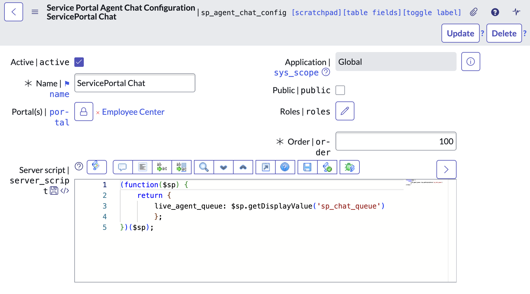 Navigate to the "Service Portal Agent Chat Configuration" record