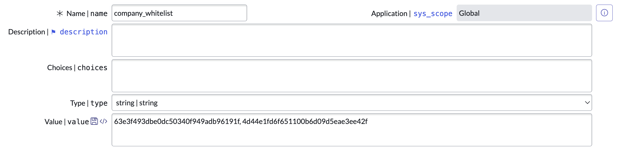 gs.getProperty('company_whitelist', '[]').split(',').map(String.trim).indexOf(current.company.toString()) > -1;